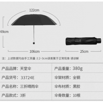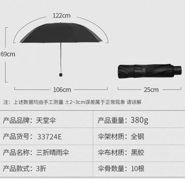 天堂33724E黑胶十骨三折晴雨伞