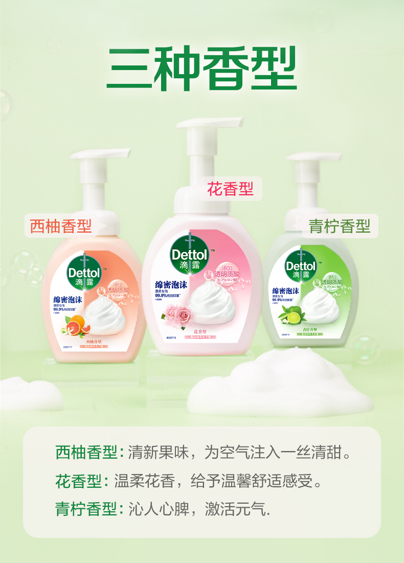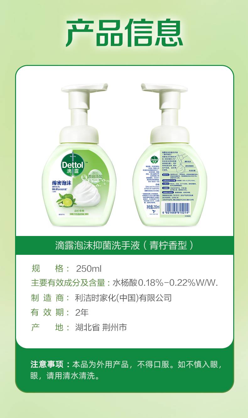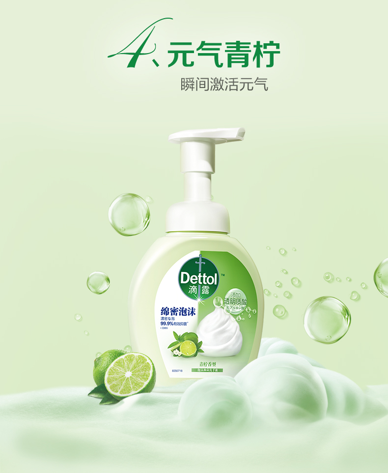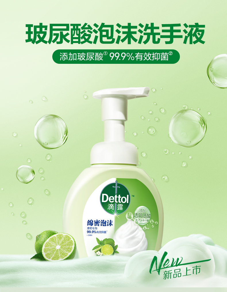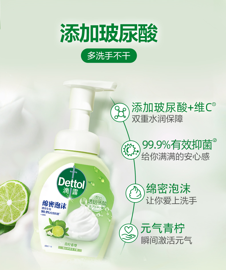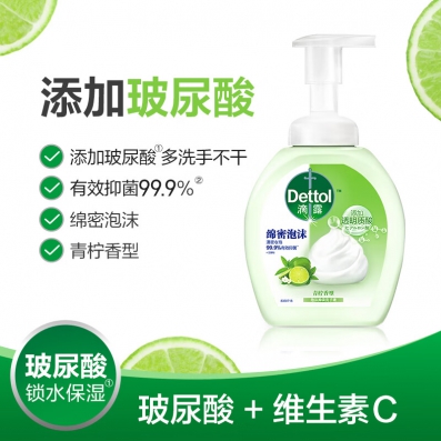 滴露Dettol玻尿酸泡沫洗手液青柠香型250ml 有效抑菌 99.9%添加玻尿酸泡沫丰富易冲洗