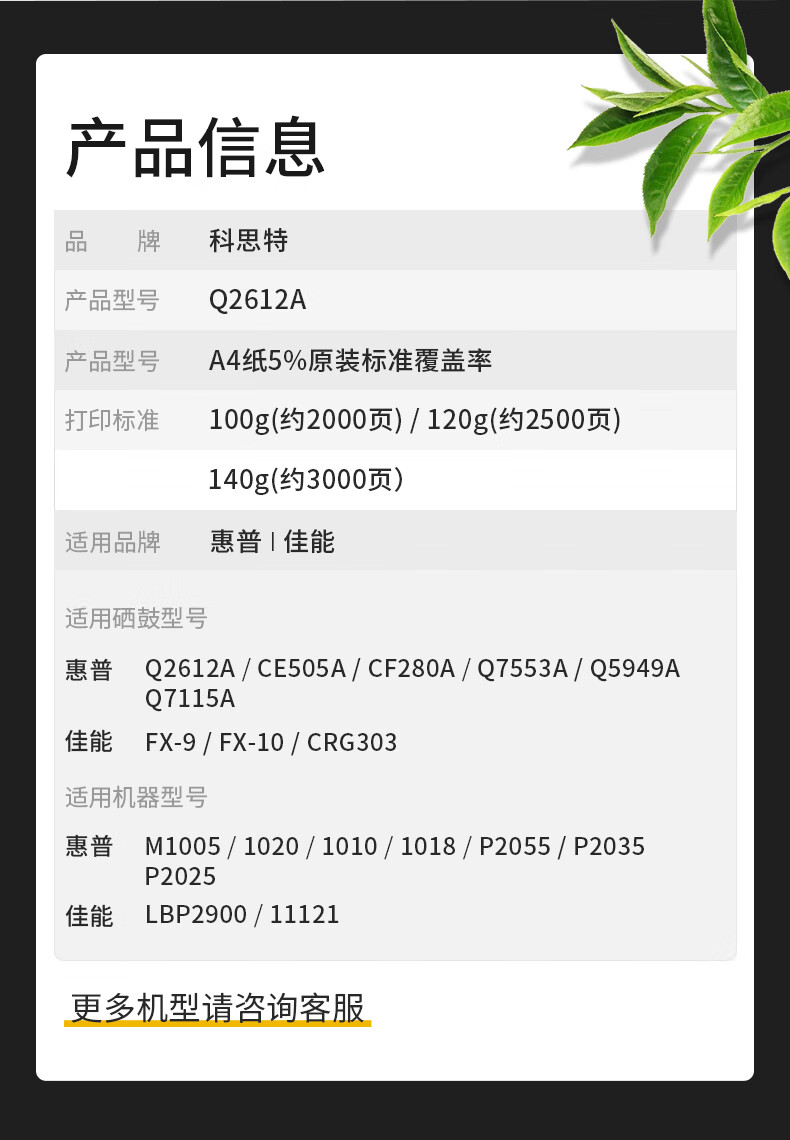 科思特Q2612A碳粉 适用惠普打印机墨粉 12A M1005 1020 CF280A 佳能FX-9 120g(2500页)1支 加黑粉 专业版