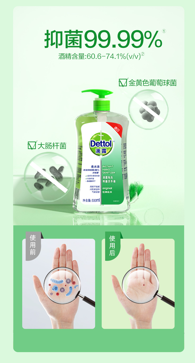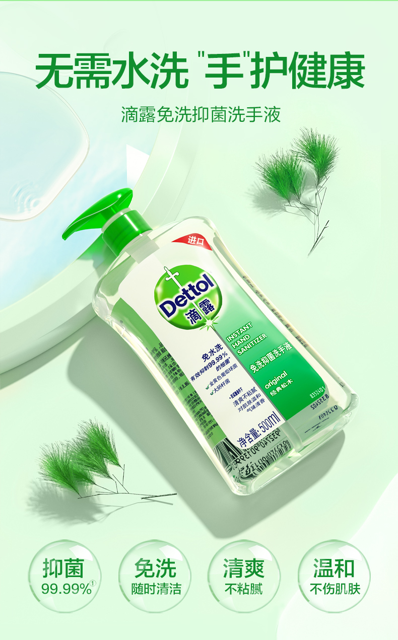 滴露Dettol 酒精免洗抑菌洗手液 酒精洗手液 经典松木 500ml/瓶 泰国进口 免洗手消毒液 儿童家用