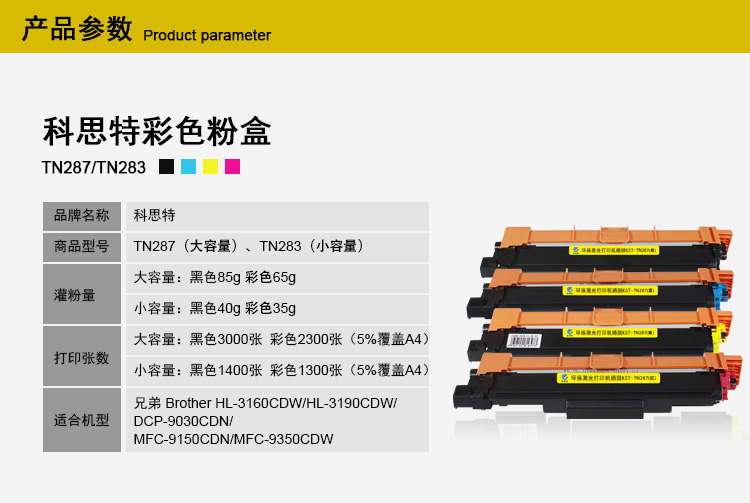 科思特 TN287粉盒 适用兄弟打印机 HL3160 DCP9030 MFC9150 黄色 Y TN287碳墨盒 (大容量)专业版